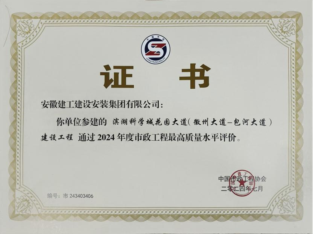 近日,中國市政工程協(xié)會(huì )頒發(fā)了2024年度市政工程最高質(zhì)量水平評價(jià)獎證書(shū),建工安裝濱湖科學(xué)城花園大道(徽州大道-包河大道)建設工程項目榮獲市政工程最高質(zhì)量水平評價(jià)獎,這是本項目繼榮獲“華東優(yōu)質(zhì)安裝工程獎”、“黃山杯”之后的又一國家級獎項。