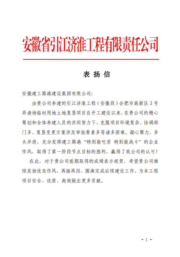 日前,建工路港引江濟淮2號棄渣場(chǎng)復墾項目收到安徽省引江濟淮工程有限責任公司的表?yè)P信。