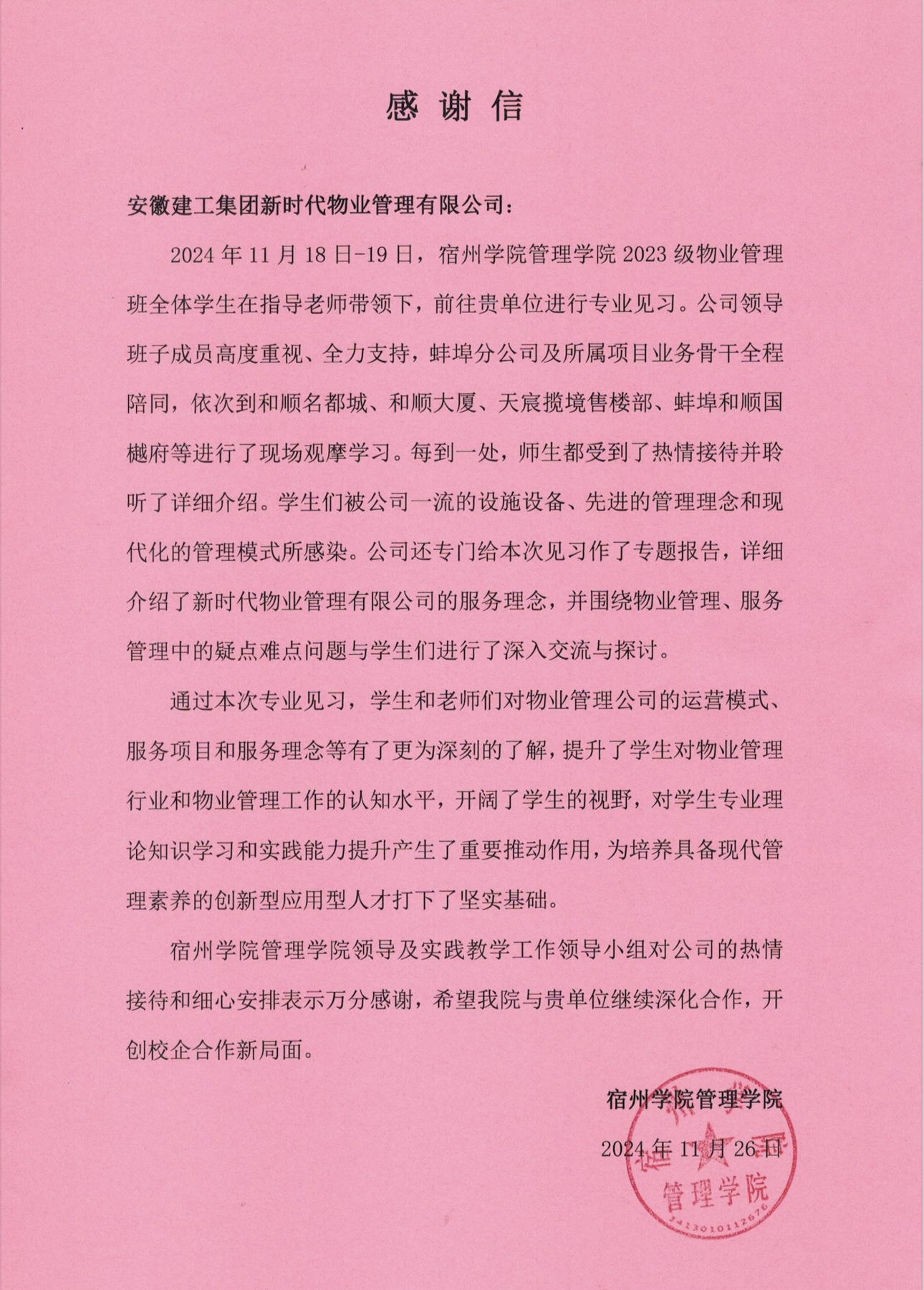 近日,物業(yè)公司榮幸收到來(lái)自宿州學(xué)院管理學(xué)院的感謝信。信中,管理學(xué)院對物業(yè)公司在專(zhuān)業(yè)見(jiàn)習中的熱情接待與精心安排表達了深切謝意。