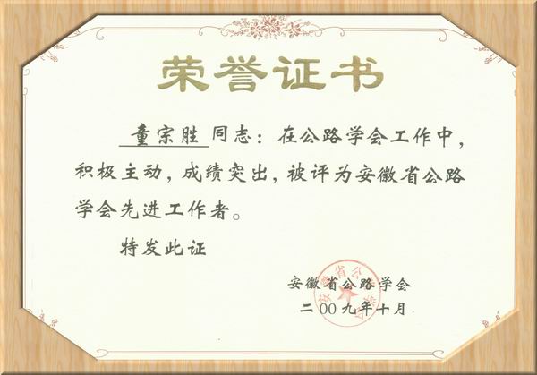 從近日結束的安徽省公路學(xué)會(huì )成立30周年慶祝大會(huì )傳來(lái)好消息,公司董事長(cháng)、總經(jīng)理童宗勝榮獲安徽省公路學(xué)會(huì )“先進(jìn)工作者”稱(chēng)號。大會(huì )向童董事長(cháng)頒發(fā)了獲獎證書(shū)。