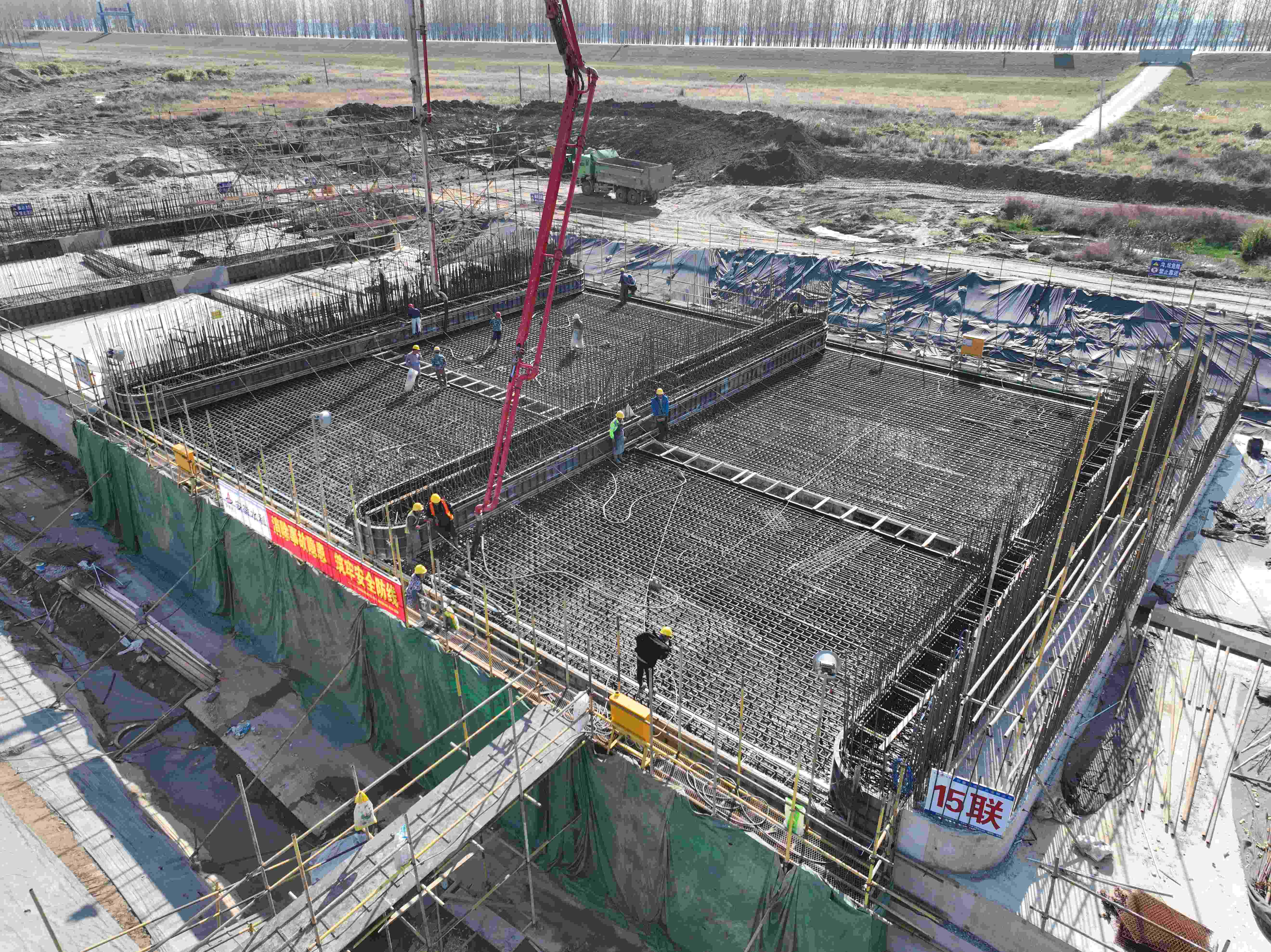 第2聯(lián)和第16聯(lián)閘底板的順利澆筑,標志著(zhù)程營(yíng)進(jìn)洪閘閘底板施工已完成80%,預計年前完成全部閘室底板澆筑。另外,經(jīng)過(guò)項目團隊晝夜奮戰,全長(cháng)514.8m的下游防淘墻現已完成220m(共計2600方混凝土),計劃12月15日全部澆筑完成;程營(yíng)進(jìn)洪閘左右岸上下游翼墻、深水孔、左右岸岸墻及部分下游引水孔計劃在年前完成。