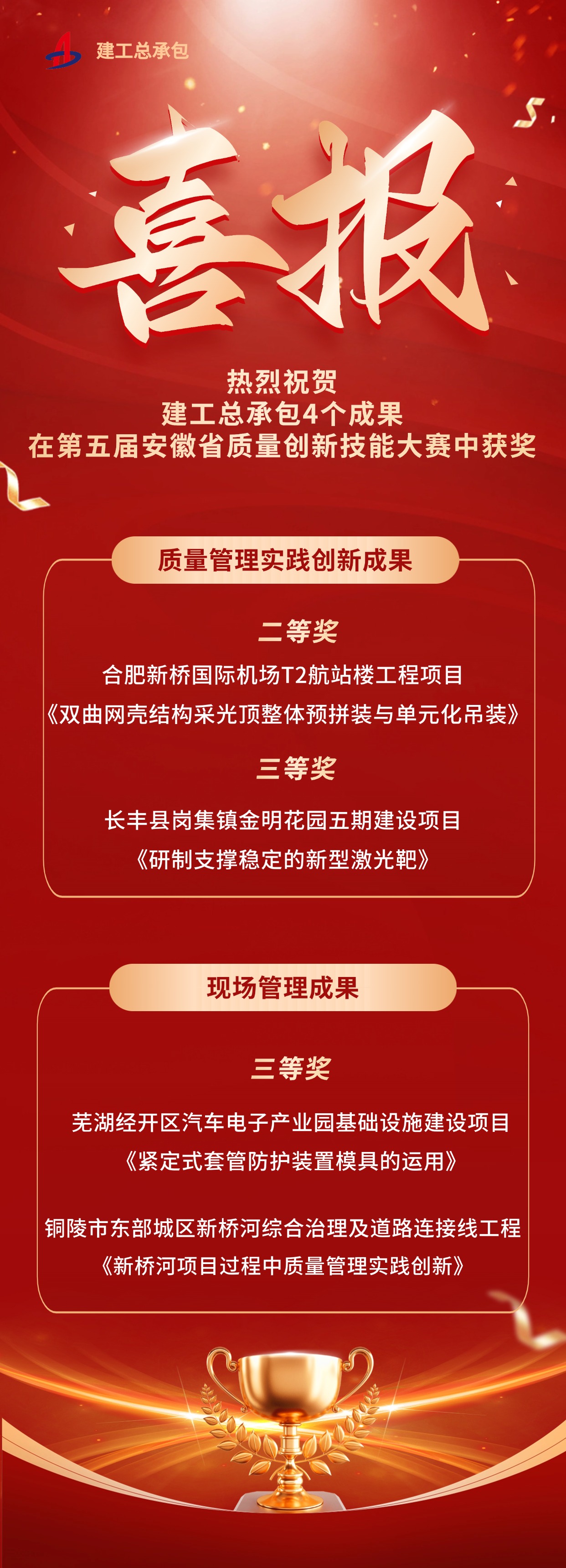 12月2日至5日,第五屆安徽省質(zhì)量創(chuàng )新技能大賽在淮南舉行,建工總承包代表安徽建工集團現場(chǎng)發(fā)布作品,4個(gè)項目從348個(gè)參賽項目中脫穎而出,分獲質(zhì)量創(chuàng )新和現場(chǎng)管理類(lèi)二、三等獎。