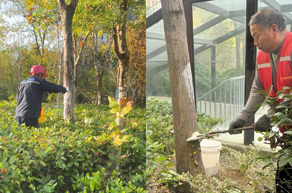 霜凍、寒潮如冷酷殺手,威脅著(zhù)綠化植物的健康與景觀(guān)效果。物業(yè)公司綠化師傅們妙招頻出,在精心落實(shí)日??茖W(xué)養護之余,對新植或不耐寒樹(shù)木重點(diǎn)呵護,逐一為樹(shù)干刷上潔白防護漆,宛如給樹(shù)木穿上“防護服”;部分嬌弱植株則裹上防寒布,變身冬日“暖寶寶”,靜靜守護,只待來(lái)年春歸時(shí),重煥滿(mǎn)園蔥郁。