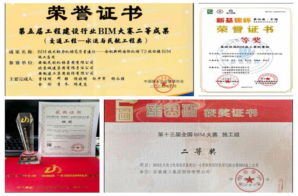 創(chuàng )新驅動(dòng),科技強企。建工總承包高度重視BIM技術(shù)的融合應用,自合肥新橋國際機場(chǎng)T2航站樓工程項目啟動(dòng)以來(lái),通過(guò)多專(zhuān)業(yè)模型深化設計、BIM+AR技術(shù)、研發(fā)智慧建造云平臺等舉措解決設計圖紙各專(zhuān)業(yè)碰撞,實(shí)現BIM模型可視化、質(zhì)量驗評、計量支付、進(jìn)度管控和安全管理的全面聯(lián)動(dòng),為項目建設提質(zhì)增速提供堅實(shí)保障。今年以來(lái),項目先后獲評第五屆工程建設行業(yè)BIM大賽二等成果、“新基建杯”BIM大賽一等成果、“龍圖杯”BIM大賽二等成果、第七屆“優(yōu)路杯”全國B(niǎo)IM技術(shù)大賽銀獎5項國家級獎項。
