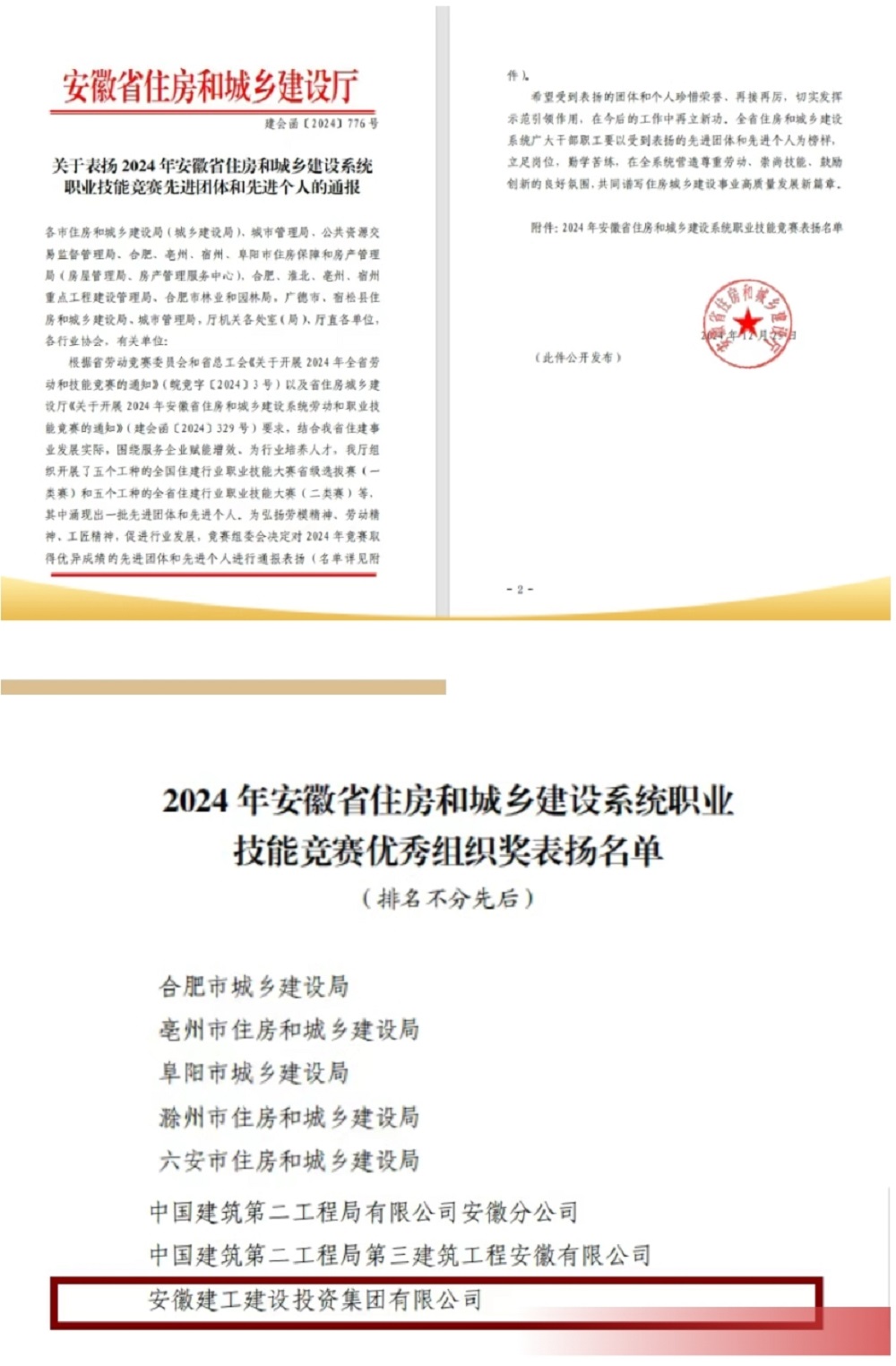 近日,安徽省住房和城鄉建設廳發(fā)布《關(guān)于表?yè)P2024年安徽省住房和城鄉建設系統職業(yè)技能競賽先進(jìn)團體和先進(jìn)個(gè)人的通報》,對2024年競賽取得優(yōu)異成績(jì)的先進(jìn)團體和先進(jìn)個(gè)人進(jìn)行通報表?yè)P。其中,建工建投集團喜獲優(yōu)秀組織獎!另4名員工喜獲先進(jìn)個(gè)人表?yè)P。