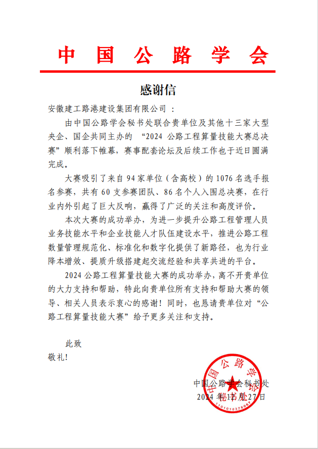 近日,中國公路學(xué)會(huì )向公司發(fā)來(lái)感謝信,感謝公司在“2024公路工程算量技能大賽總決賽”活動(dòng)中所做出的積極貢獻。在此次全國算量大賽活動(dòng)中,公司積極籌備,開(kāi)展預賽選拔及過(guò)程培訓,最終參賽學(xué)員取得了優(yōu)異的成績(jì)。