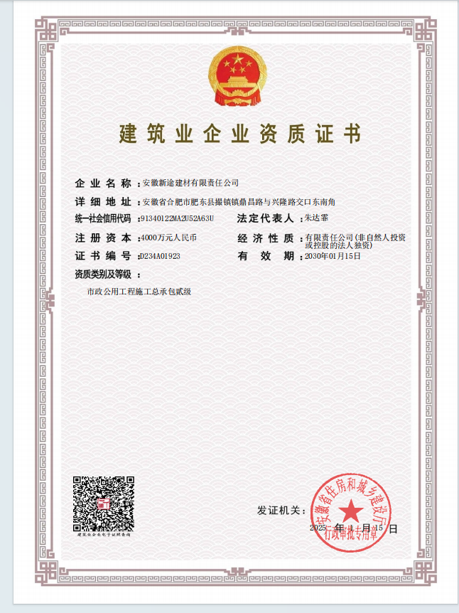近日,經(jīng)安徽省住房和城鄉建設廳正式批準,建工建材安徽新途建材有限責任公司喜獲市政公用工程施工總承包二級資質(zhì)。