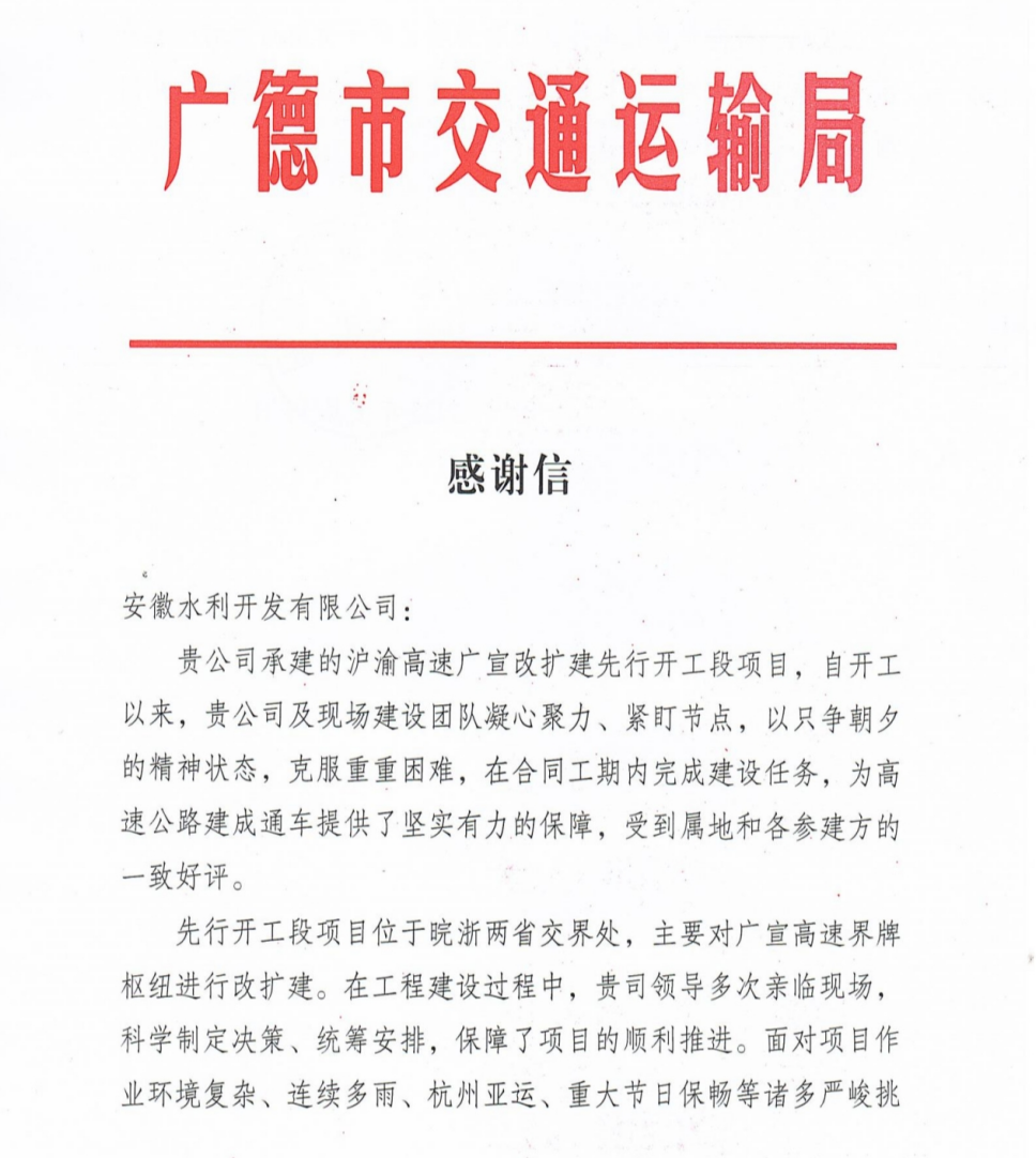 近日,安徽水利廣宣項目收到來(lái)自廣德市交通運輸局的感謝信,感謝項目對廣宣高速建設和經(jīng)濟社會(huì )發(fā)展所作出的努力和貢獻。