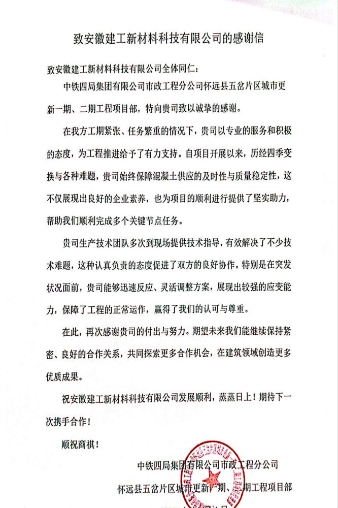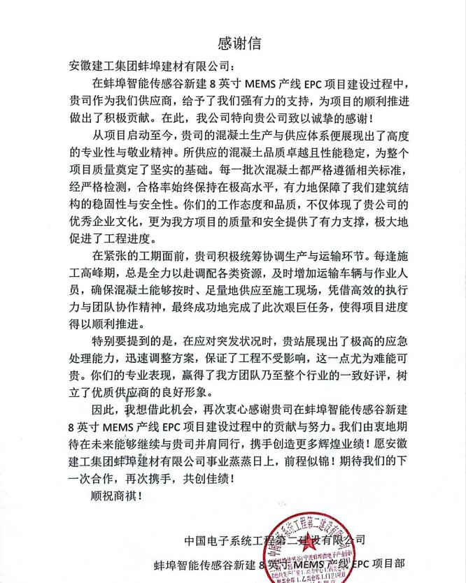 建工建材憑借其卓越的產(chǎn)品質(zhì)量、高效的供應體系以及出色的服務(wù)保障表現、一絲不茍、精益求精的工作精神,收到了來(lái)自中國電子、中國中鐵等央國企的感謝信。