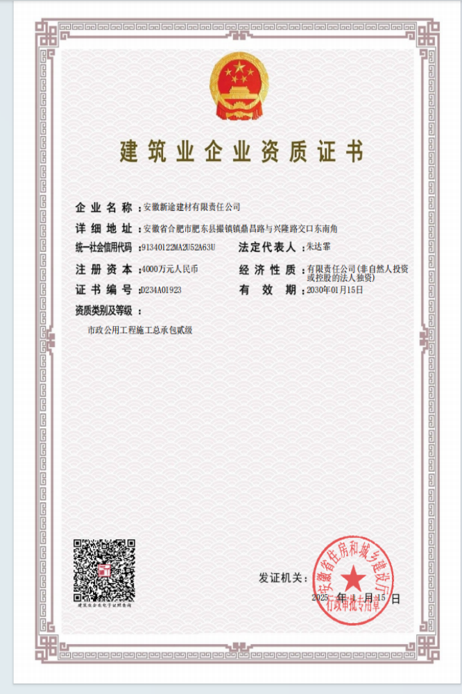 安徽新途建材有限責任公司喜獲安徽省住房和城鄉建設廳正式批準,市政公用工程施工總承包二級資質(zhì)順利通過(guò)審核,標志著(zhù)新途建材在市政公用工程領(lǐng)域邁上了新的臺階,市場(chǎng)競爭力得到顯著(zhù)提升,為公司的業(yè)務(wù)范圍拓展奠定了堅實(shí)的基礎。