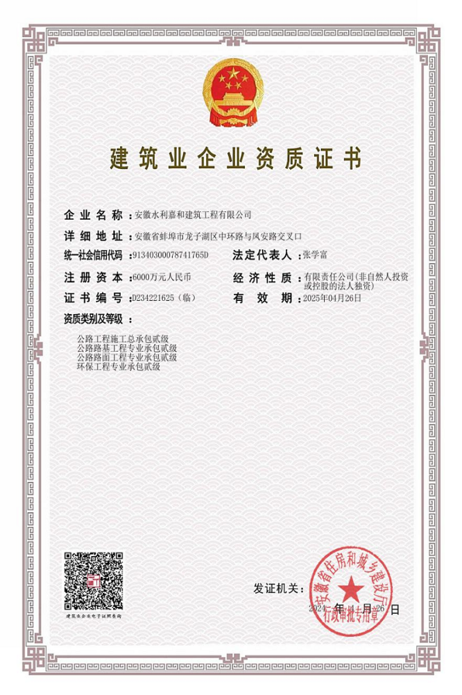經(jīng)建筑主管部門(mén)核準,嘉和建筑成功獲批公路工程施工總承包貳級、公路路基工程專(zhuān)業(yè)承包貳級、公路路面工程專(zhuān)業(yè)承包貳級、環(huán)保工程專(zhuān)業(yè)承包貳級資質(zhì)。