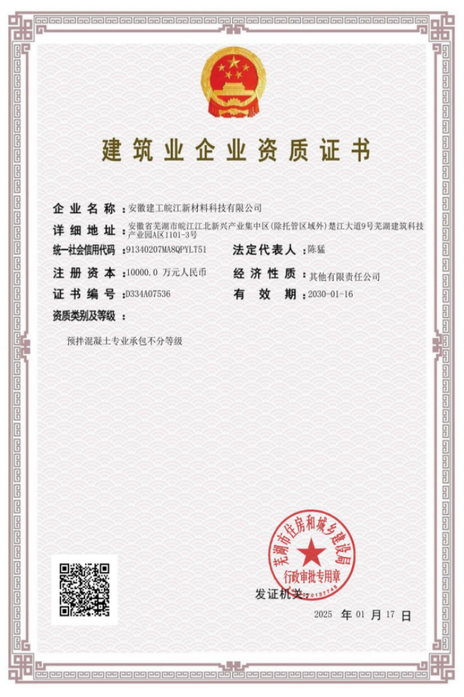 安徽建工皖江新材料科技有限公司經(jīng)蕪湖市住房和城鄉建設局正式批準,獲得預拌混凝土專(zhuān)業(yè)承包資質(zhì),此次資質(zhì)的取得,不僅代表皖江新材料從建設期到運營(yíng)期的轉型邁出了重要一步,更為公司在蕪湖預拌混凝土市場(chǎng)的深入開(kāi)拓提供了新機遇。