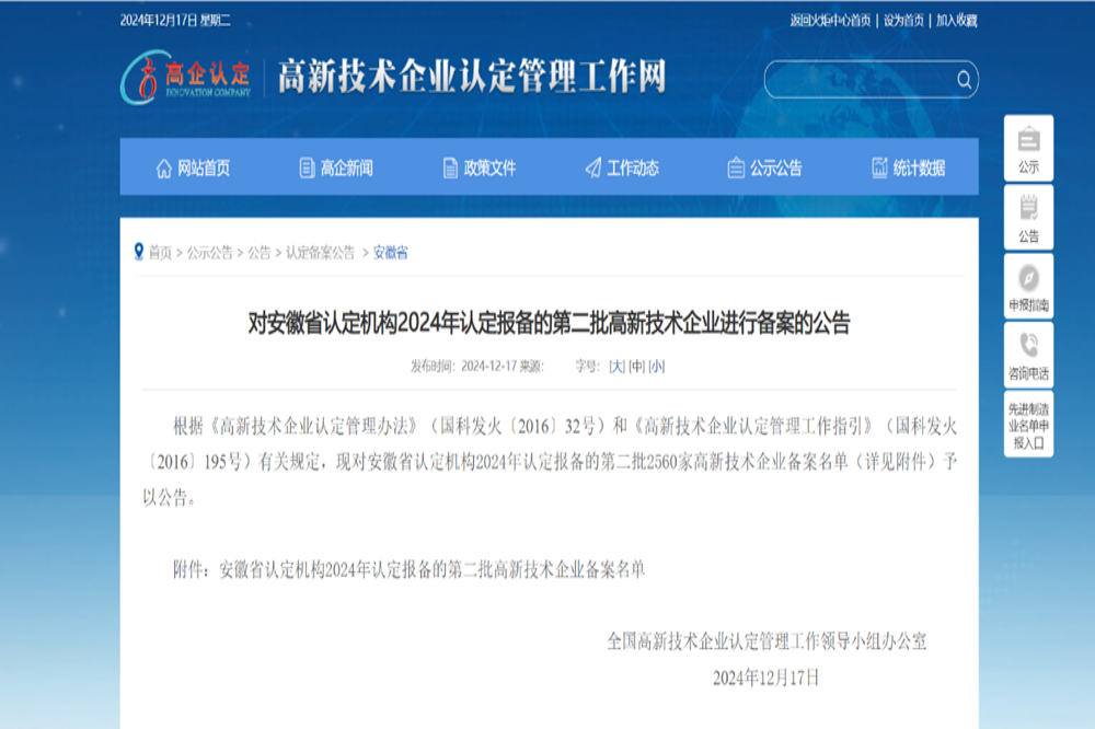 國家高新技術(shù)企業(yè)認定管理工作網(wǎng)發(fā)布《對安徽省認定機構2024年認定報備的第二批高新技術(shù)企業(yè)進(jìn)行備案的公告》,建工建材安徽瑞特公司名列其中,成功獲評國家“高新技術(shù)企業(yè)”。