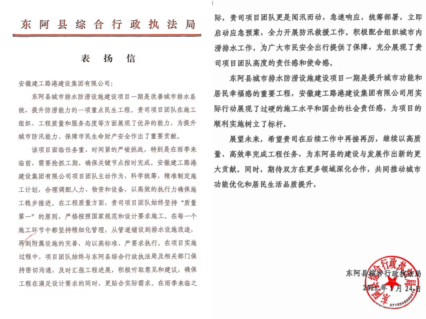 1月24日,建工路港山東排澇項目收到了來(lái)自東阿縣綜合行政執法局的表?yè)P信,對項目部出色表現給予了高度評價(jià)。