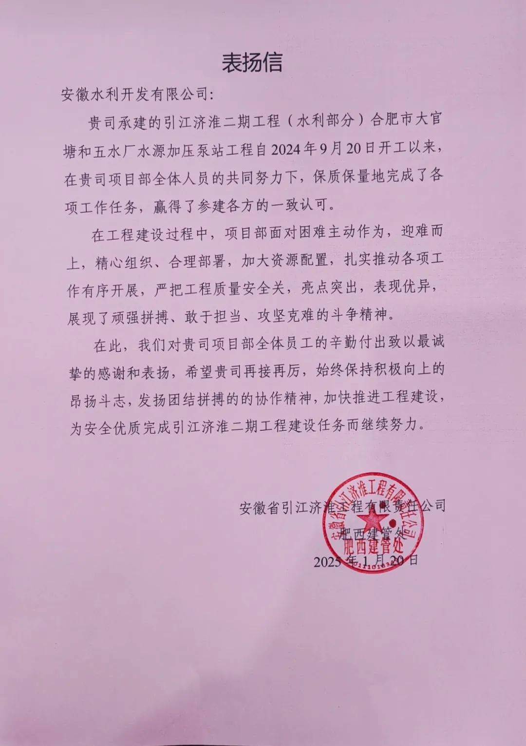 引江濟淮加壓泵站項目收到業(yè)主表?yè)P信,信中指出,自2024年9月20日開(kāi)工以來(lái),項目部全體人員面對困難主動(dòng)作為,迎難而上,精心組織、合理部署,加大資源配置,扎實(shí)推動(dòng)各項工作有序開(kāi)展,嚴把工程質(zhì)量安全關(guān),亮點(diǎn)突出,表現優(yōu)異,展現了頑強拼搏、敢于擔當、攻堅克難的斗爭精神,贏(yíng)得了參建各方的一致認可。同時(shí),項目?jì)晌粏T工榮獲業(yè)主單位2024年勞動(dòng)競賽“先進(jìn)個(gè)人”稱(chēng)號。
