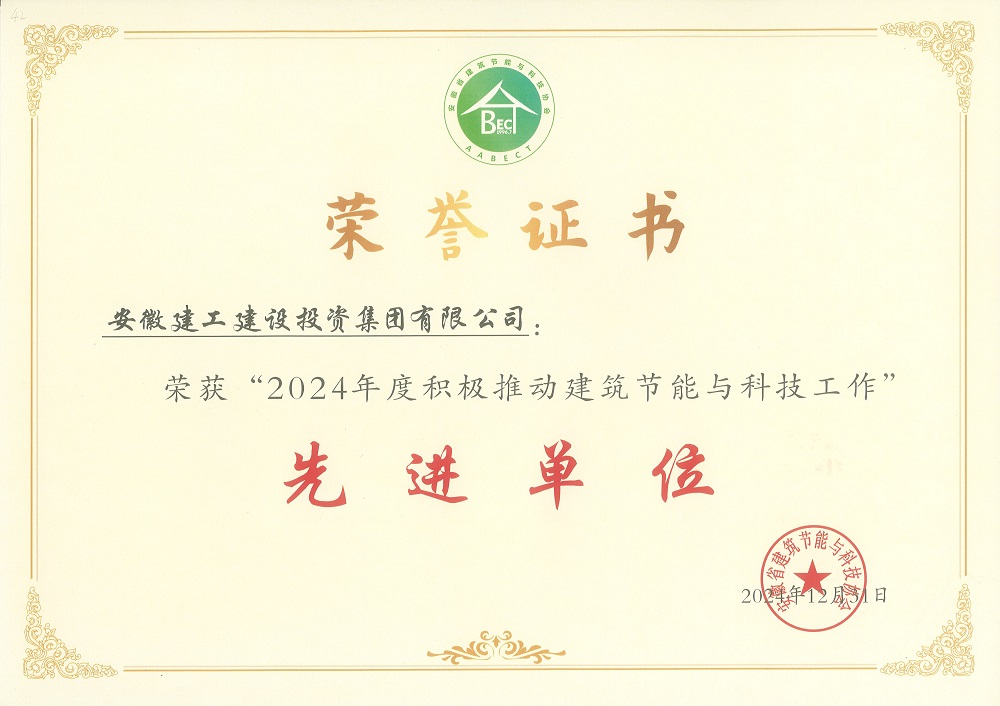 近日,建工建投集團喜獲安徽省建筑節能與科技協(xié)會(huì )頒發(fā)的“2024年度積極推動(dòng)建筑節能與科技工作先進(jìn)單位”稱(chēng)號。
