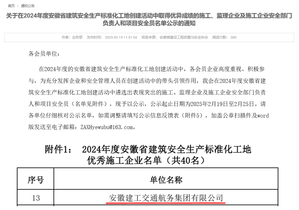 近日,安徽省建筑安全生產(chǎn)標準化工地創(chuàng )建活動(dòng)結果揭曉,安徽建工交通航務(wù)集團有限公司憑借扎實(shí)的安全管理,斬獲多項殊榮。