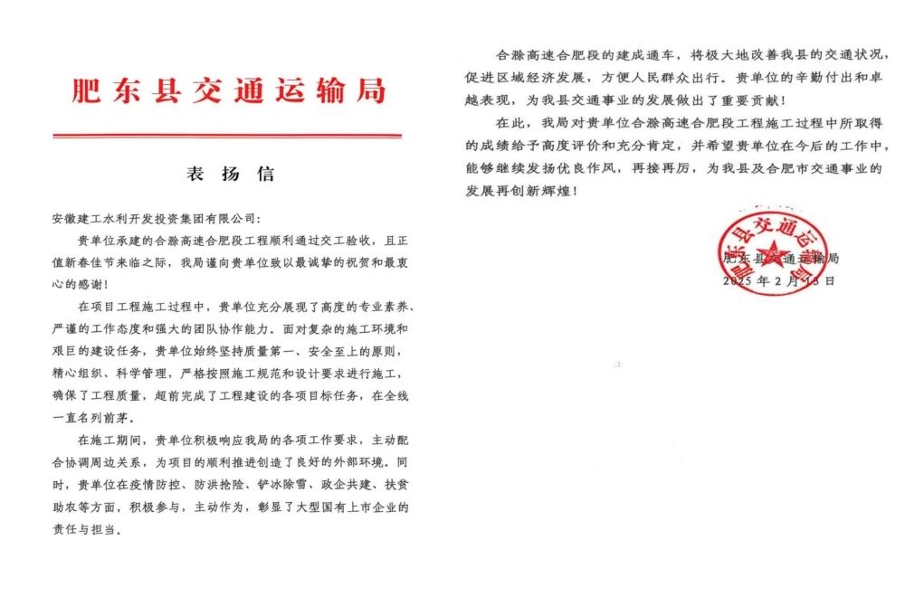 信中指出,合滁高速項目展現出了強大的專(zhuān)業(yè)實(shí)力和高效的執行能力,在工程質(zhì)量、進(jìn)度、安全以及文明施工等方面均表現出色,為肥東縣的交通基礎設施建設做出了重要貢獻,樹(shù)立了行業(yè)標桿。