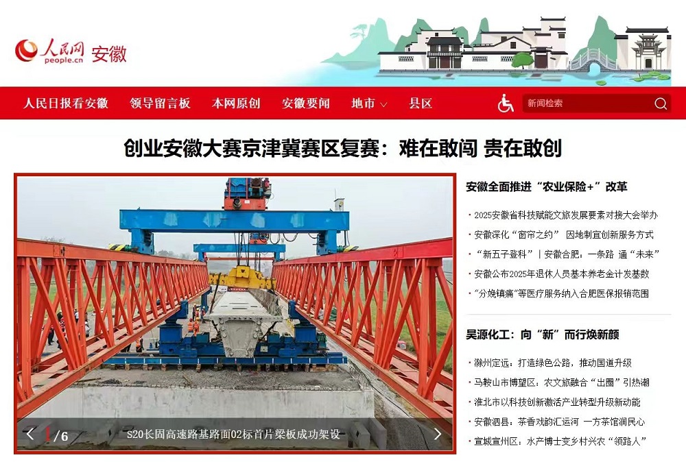 2025年10月15日,建工建投集團S20長(cháng)固高速路基路面02標首片梁板成功架設。人民網(wǎng)記者深入項目一線(xiàn)展開(kāi)報道,稿件登上人民網(wǎng)安徽頻道首頁(yè)。