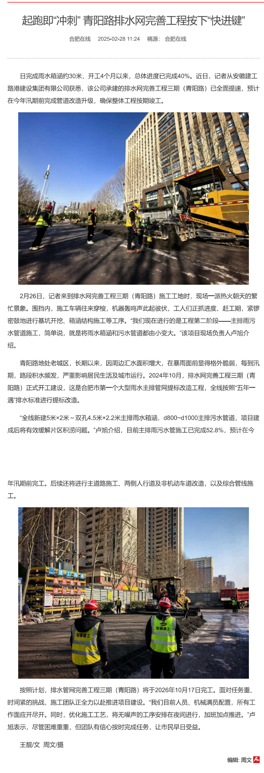 近日,建工路港青陽(yáng)路排水網(wǎng)完善工程建設再提速,力爭高質(zhì)量完成任務(wù),讓市民早日受益,合肥日報以《起跑即“沖刺” 青陽(yáng)路排水網(wǎng)完善工程按下“快進(jìn)鍵”》為題進(jìn)行了專(zhuān)題報道。