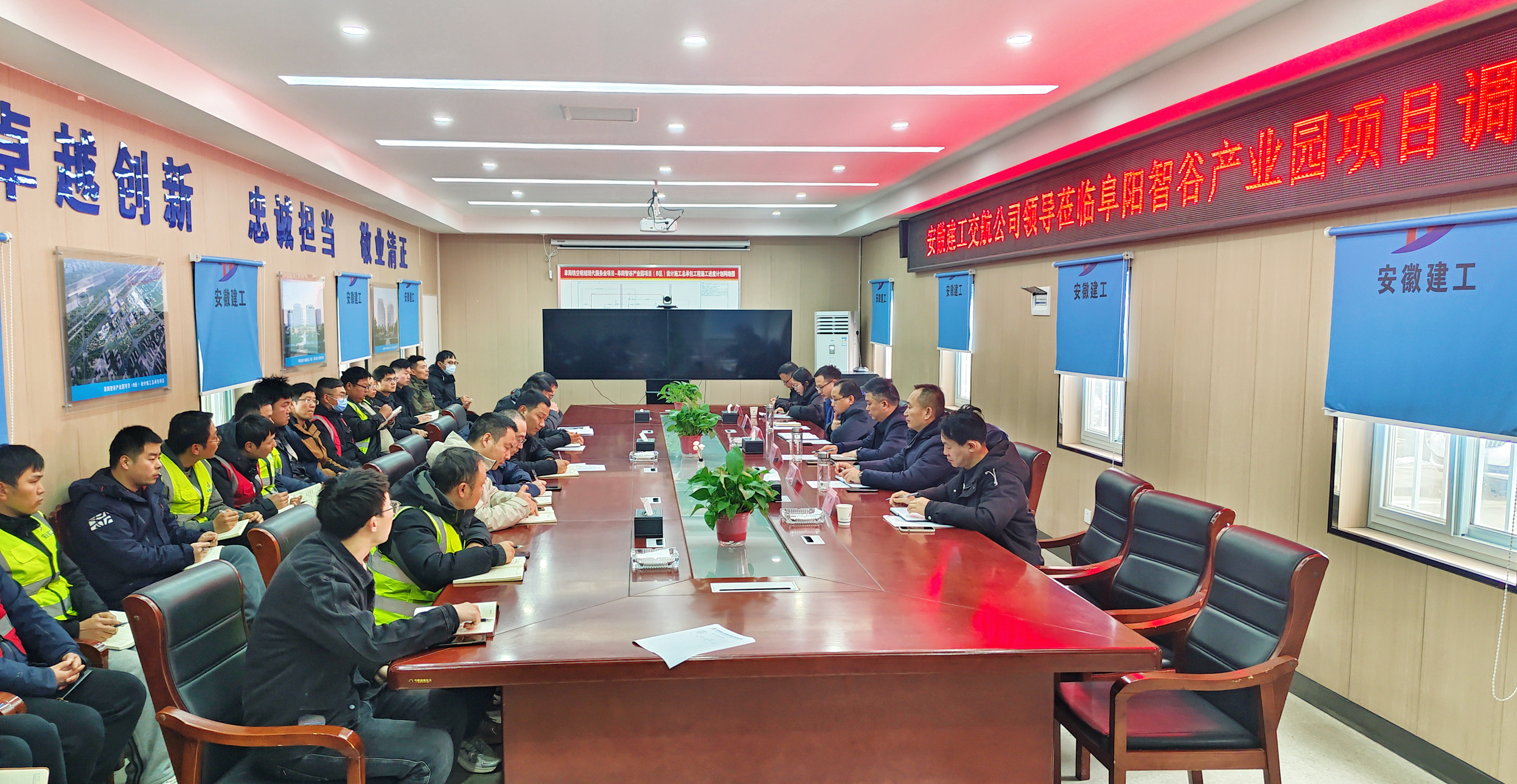 公司領(lǐng)導侯田漢、邢磊,工程管理部、安全環(huán)保監察部、黨群工作部(人力資源部、團委)負責人,阜陽(yáng)智谷項目全體人員參加會(huì )議。
