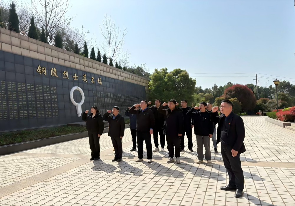 全體參與人員身著(zhù)黑色上衣,列隊前往烈士紀念塔敬獻鮮花,集體默哀致敬。隨后,我們移步烈士陵園,在黨旗下重溫入黨誓詞,鏗鏘誓言回蕩于蒼松翠柏之間,彰顯新時(shí)代黨員的堅定信念。最后,在烈士紀念館中,我們跟隨講解員回顧銅陵地區革命斗爭歷史,通過(guò)珍貴文物和影像資料深切感悟先烈英勇無(wú)畏的奉獻精神。