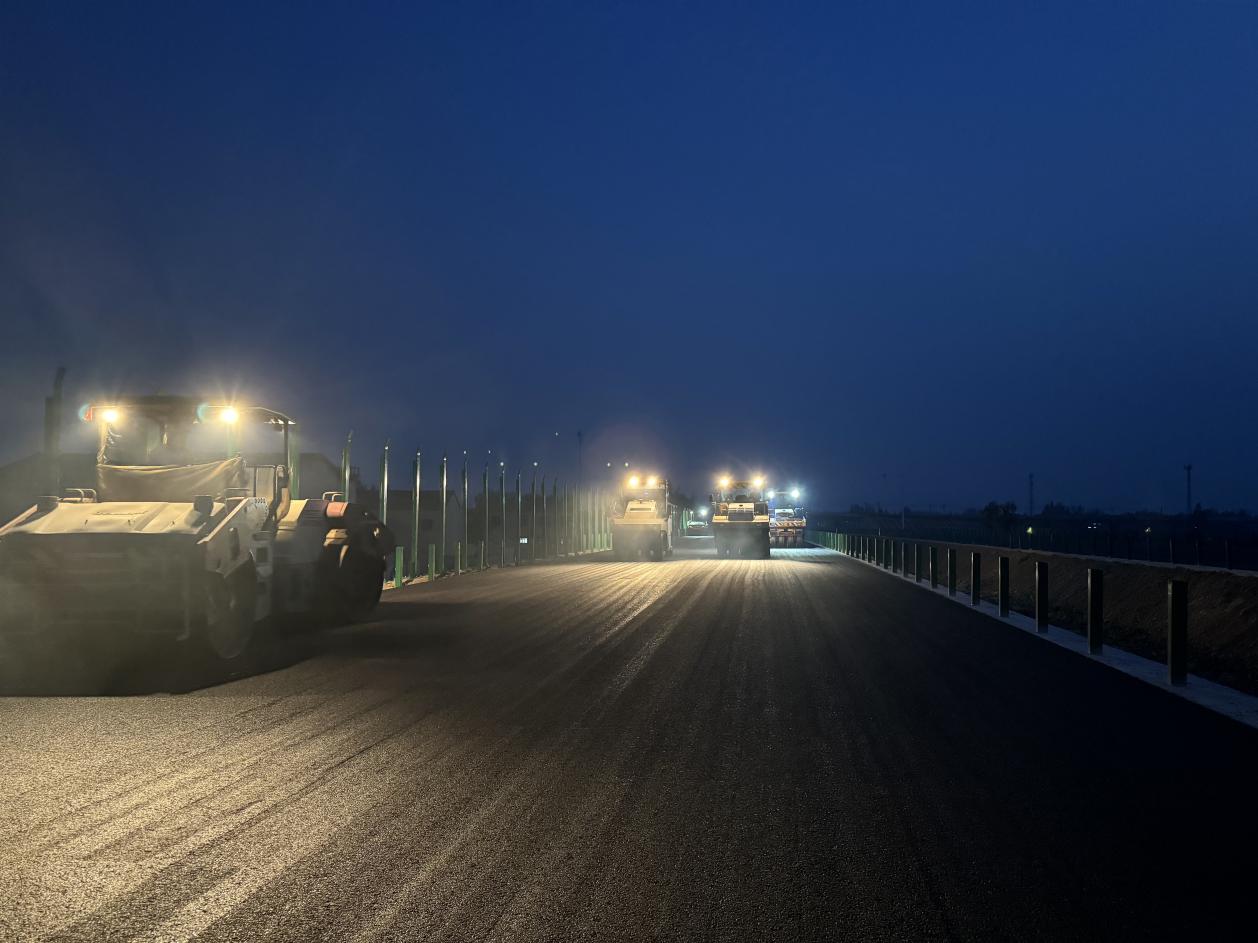 面對地方協(xié)調、交叉施工、惡劣天氣等不利因素,項目團隊積極與當地政府單位溝通,迅速調整施工計劃,組織多班組交叉作業(yè),黨員團員帶頭加班加點(diǎn),日夜奮戰在施工一線(xiàn),自2024年10月至今,水穩層完成總工程量的83%,瀝青攤鋪完成總工程量的90%,以高效施工全力推進(jìn)項目建設。