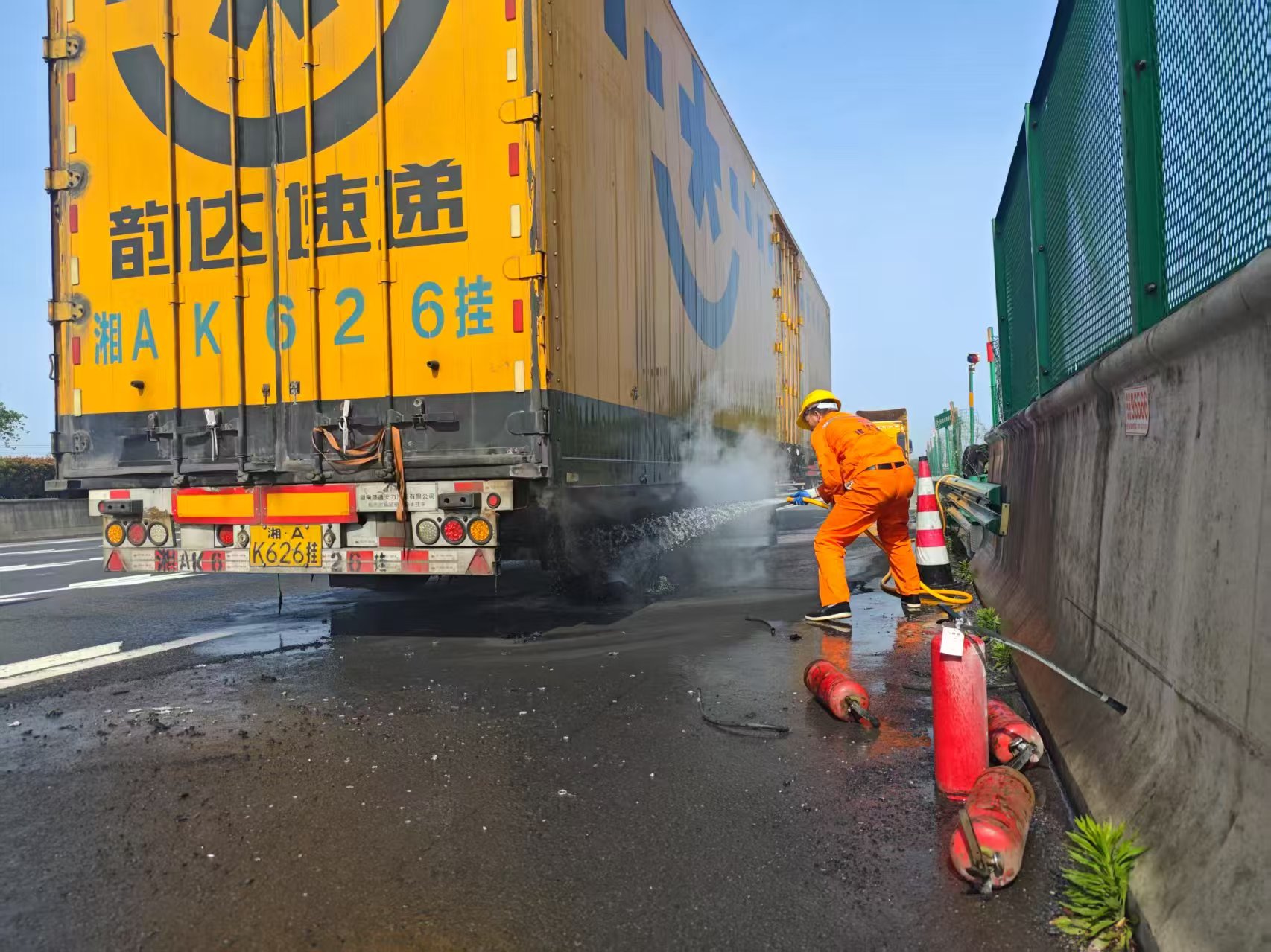 當天,施工現場(chǎng)的工作人員發(fā)現不遠處一輛物流車(chē)濃煙滾滾,火苗正從車(chē)廂處不斷竄出。項目負責人接報后,迅速組織現場(chǎng)施工人員攜帶滅火設備趕赴現場(chǎng)。同時(shí),安排專(zhuān)人在后方設置警示標志,疏導交通,防止二次事故發(fā)生。
