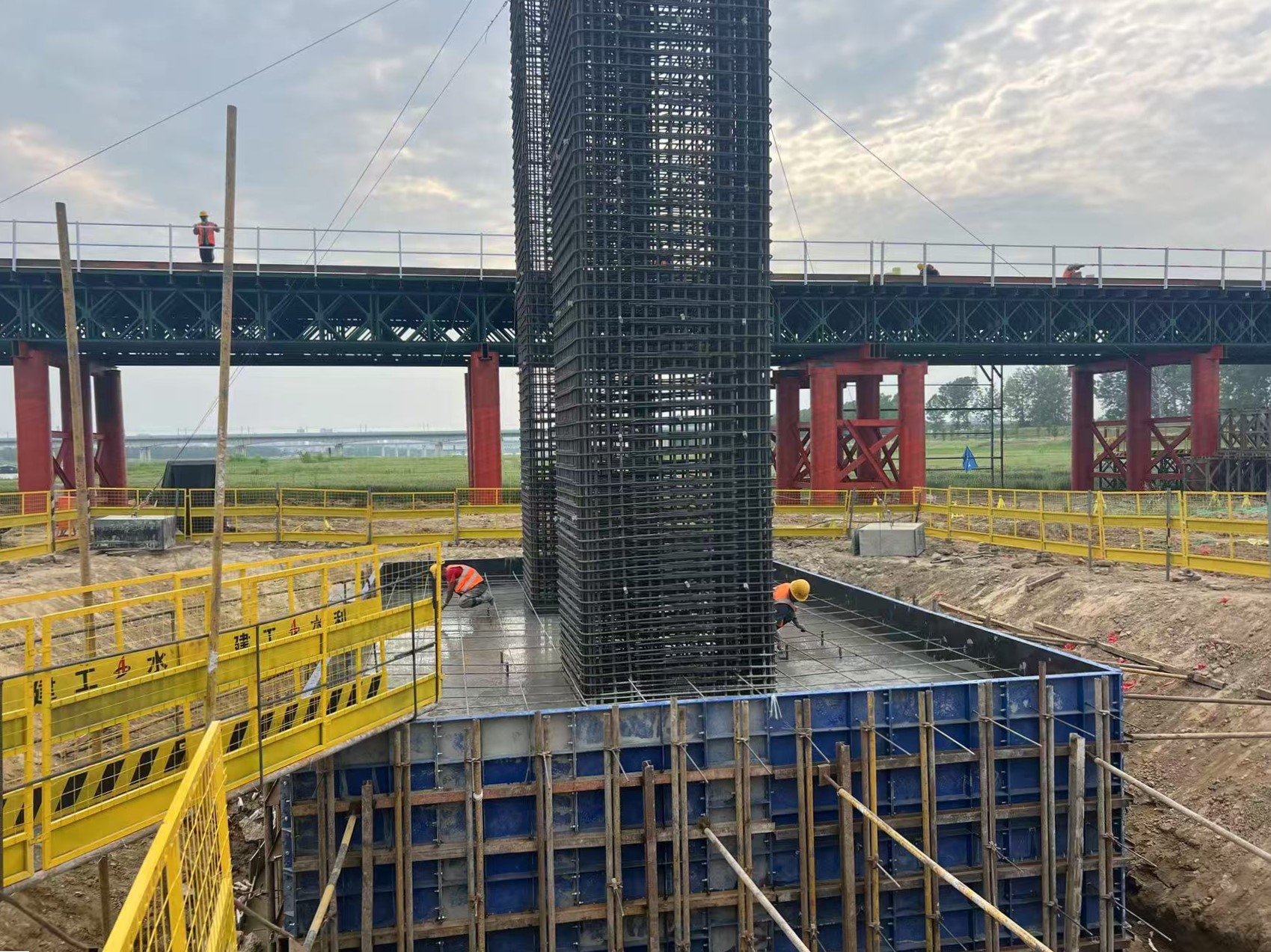 為確保此次澆筑工作順利進(jìn)行,項目周密部署,從施工方案制定到現場(chǎng)資源調配,每一個(gè)環(huán)節都嚴格把關(guān),并做好安全技術(shù)交底。施工過(guò)程中,在鋼筋綁扎焊接、模板安裝、墩柱鋼筋預埋、混凝土澆筑振搗、找平抹面、溫控監測及覆蓋養護等關(guān)鍵環(huán)節,安排專(zhuān)人全程監督,落實(shí)各項標準化施工要求,全力確保首個(gè)承臺高質(zhì)量完成澆筑。