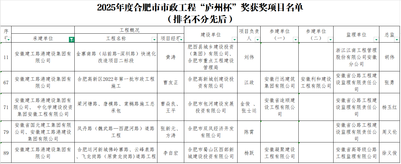 近日,合肥市市政工程協(xié)會(huì )正式公布《關(guān)于2025年度合肥市市政工程“廬州杯”獎獲獎項目名單的通知》,建工路港五個(gè)項目榮獲該獎項。