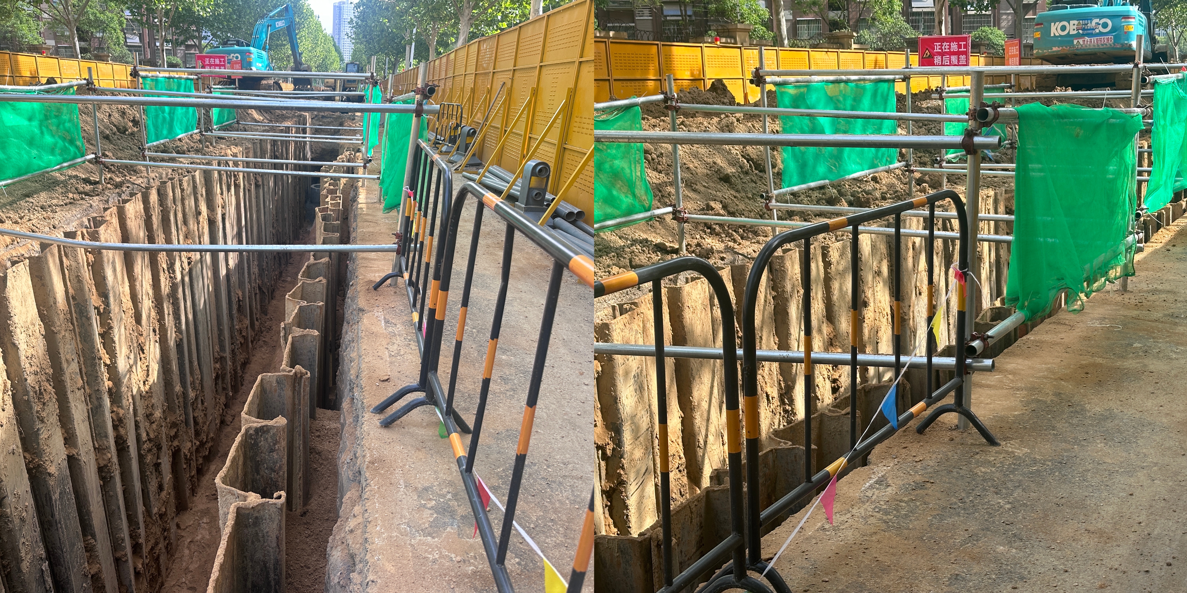 在市政道路雨污改造工程中,溝槽臨邊防護固定難題一直是施工安全管控的重點(diǎn)。徐河4標項目部立足實(shí)際,創(chuàng )新推出“鋼管搭接 + 安全網(wǎng)” 組合防護體系。該體系通過(guò)科學(xué)設計鋼管搭接結構,極大增強了防護架的穩固性,有效降低作業(yè)人員墜落風(fēng)險;模塊化的設計理念,使其能根據不同溝槽斷面尺寸靈活調整,顯著(zhù)提升施工適應性。這一創(chuàng )新防護措施,為項目安全、高效推進(jìn)構筑起堅實(shí)可靠的安全屏障。