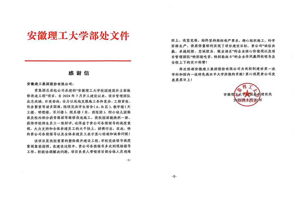近日,安徽理工大學(xué)給安徽建工集團發(fā)來(lái)感謝信。信中對建工總承包公司精心組織施工、科學(xué)安排生產(chǎn)、高標準高質(zhì)量完成安徽理工大學(xué)校園建筑外立面維修改造工程項目給予好評,對安徽建工集團助力其創(chuàng )建世界一流學(xué)科和國內一流特色高水平大學(xué)表示感謝。