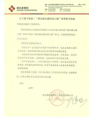 日前,北京盛達森國際工程承包有限公司致函安徽建工集團,盛贊海外公司副總經(jīng)理琚效三在利比亞市政項目做出的突出貢獻。北京盛達森國際工程承包有限公司“感動(dòng)盛達森特別人物”評選委員會(huì )授予琚效三副總經(jīng)理“感動(dòng)盛達森特別人物”榮譽(yù)稱(chēng)號和一萬(wàn)元人民幣榮譽(yù)獎金。推選詞為:“他來(lái)自于一直與我們并肩奮斗的金牌伙伴,他是安徽建工海外公司副總,他同時(shí)執行我司利比亞市政項目經(jīng)理的角色。他在我司利比亞市政項目遇困時(shí)臨危受命、不負重托,運用豐富的海外項目經(jīng)驗,力挽狂瀾,為扭轉項目時(shí)局貢獻力量。他不是盛達森人,但卻與盛達森心手相牽;他與盛達森沒(méi)有特殊情結,卻為盛達森帶來(lái)改變,作為不是盛達森人的盛達森奉獻者,他值得敬佩?!?/DIV>