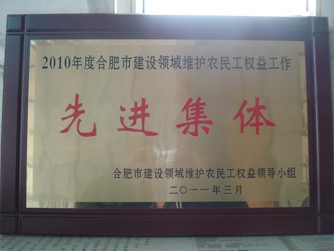 日前,安徽省第二建筑工程公司從合肥市農民工維權領(lǐng)導小組召開(kāi)的表彰大會(huì )上,捧回了“2010年度合肥市建設領(lǐng)域維護農民工權益先進(jìn)集體”的獎牌。這是自2008年以來(lái)安徽二建公司第三次獲此殊榮。