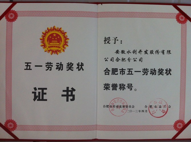 2013年4月30日,安徽水利合肥公司被合肥市勞動(dòng)競賽委員會(huì )、合肥市總工會(huì )授予了合肥市“五一勞動(dòng)獎狀”榮譽(yù)稱(chēng)號,這是合肥公司首次獲此榮譽(yù)。