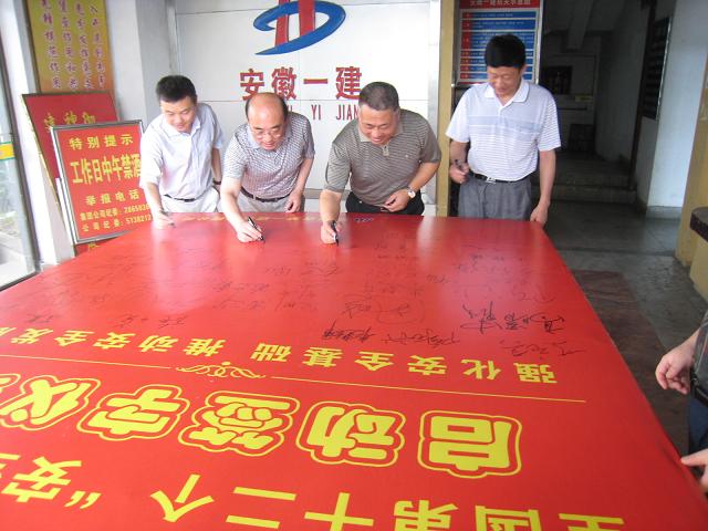 為全面貫徹落實(shí)黨中央、國務(wù)院和各級政府關(guān)于安全生產(chǎn)工作的一系列方針政策,深入開(kāi)展全國第十二個(gè)“安全生產(chǎn)月”活動(dòng),根據省住建廳《全省住房和城鄉建設系統“安全生產(chǎn)月”活動(dòng)方案》,安徽一建公司開(kāi)展安全月系列活動(dòng)。并于6月6日上午啟動(dòng)了以“強化安全基礎,推動(dòng)安全發(fā)展”為主題的安全月簽字啟動(dòng)儀式。圖為該公司領(lǐng)導班子成員在啟動(dòng)儀式上簽字。