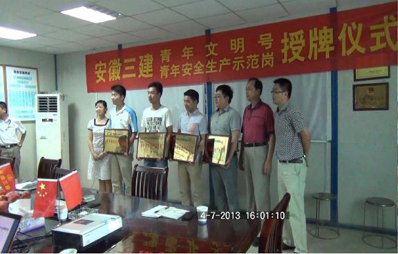 7月4日下午,安徽三建團委對2013年度首批“青年文明號”、“青年安全生產(chǎn)示范崗”進(jìn)行授牌。六公司七中搬遷項目部、七公司中科大科研綜合樓項目部、八公司中海嶺湖墅項目部、九公司創(chuàng )新平臺二期項目一標段四個(gè)項目部獲得授牌。我公司黨委副書(shū)記、紀委書(shū)記周湃、安徽建工集團團委書(shū)記邢應梅到會(huì )并講話(huà)。