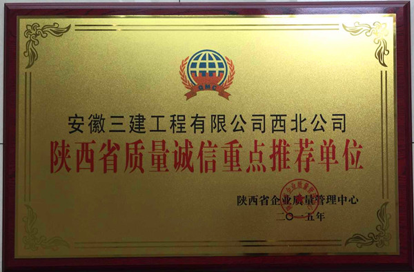 近日,安徽三建西北公司被陜西省企業(yè)質(zhì)量管理中心評為“陜西省工程質(zhì)量AAAAA級信譽(yù)單位”、“陜西省質(zhì)量誠信重點(diǎn)推薦單位”。