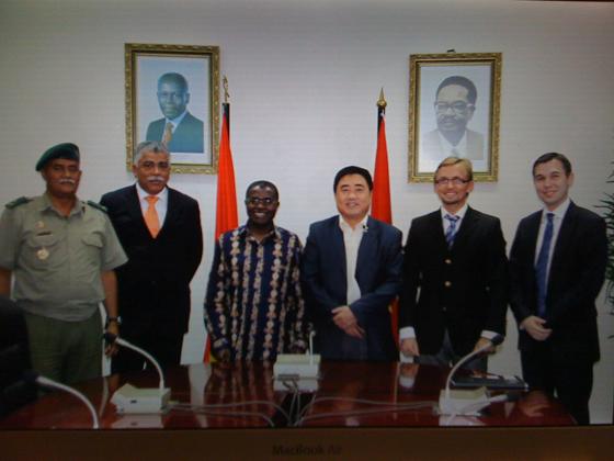 11月21日,中國駐安哥拉大使張伯倫先生設宴宴請了考察團一行。胡董事長(cháng)一行還分別與在安哥拉合作的三家公司進(jìn)行了業(yè)務(wù)洽談,并先后與JHS公司以及Solida投資公司簽訂了3900萬(wàn)美元的承包工程合同