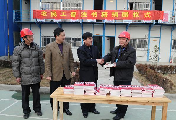 2010年元月28日下午,合肥市人民檢察院向安徽建工農民工業(yè)余學(xué)校捐贈農民工普法書(shū)籍儀式在安徽三建美亞光電項目部舉行。市檢察院黨組成員、副檢察長(cháng)黃世斌,黨組成員、政治部主任童興芝等一行四人,看望慰問(wèn)農民工兄弟,宣傳農民工法律維權知識,并現場(chǎng)捐贈《農民工普法讀本》200本。集團公司副總經(jīng)理、集團農民工業(yè)余學(xué)校常務(wù)副校長(cháng)王禮義,集團人力資源部主任胡建英,安徽三建紀委書(shū)記周湃等出席捐贈儀式。