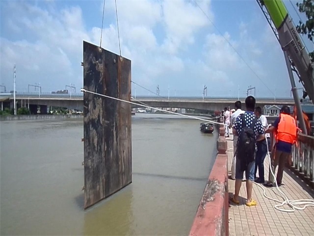 經(jīng)過(guò)十幾個(gè)小時(shí)的連夜緊張奮戰,7月8日中午,蕪申運河城區段02標境內青弋江市區段鐵橋老泵站自流涵臨江側被一塊重達8噸的鋼板加固,徹底消除度汛安全隱患。老泵站淘汰時(shí)自流涵廢棄但未拆除,主汛前項目部已組織進(jìn)行應急加固,但在長(cháng)時(shí)間高水位浸泡的情況下,仍存在較大的度汛隱患。根據蕪湖市委主要領(lǐng)導的要求,7月7日晚,項目部立即從合肥市調運厚約2厘米鋼板4塊,連夜在現場(chǎng)加工成一塊長(cháng)8米、寬6米、重達8噸的長(cháng)方形鋼板,利用吊機吊至自流涵進(jìn)口,并派潛水員對封堵情況進(jìn)行檢查,保證鋼板封堵在自流涵進(jìn)口,確保該處防洪萬(wàn)無(wú)一失。
