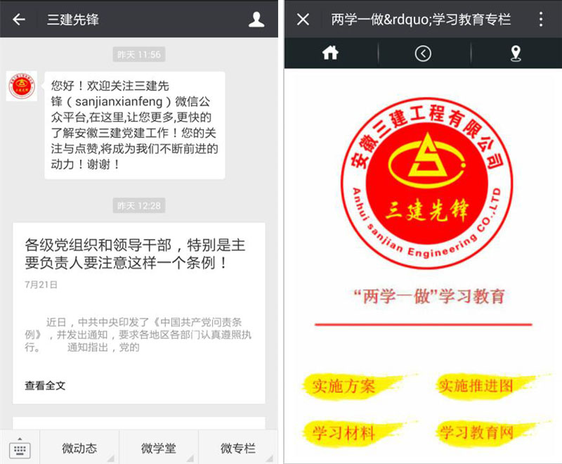 為扎實(shí)開(kāi)展好“兩學(xué)一做”學(xué)習教育,擴大黨員教育和黨建宣傳的覆蓋面,在中國共產(chǎn)黨建黨95周年之際,安徽三建公司黨委結合當前微信普及率高、信息傳遞快的特點(diǎn),創(chuàng )新黨建工作方法,開(kāi)通安徽三建黨建工作微信公眾平臺—“三建先鋒”公眾號,“黨建+”工作模式正式啟動(dòng)。