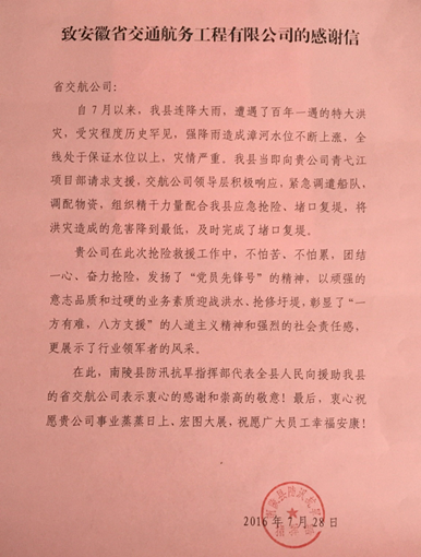 7月28日,安徽交航收到一份來(lái)自南陵縣防汛抗旱指揮部的感謝信,感謝我公司在此次搶險救災過(guò)程中做出的巨大貢獻。