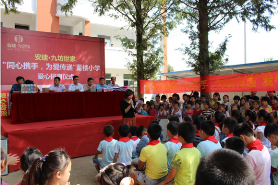 董樓小學(xué)位于潁東區冉廟鄉深度貧困鄉——丁寨村,貧困人口達4661人,由于交通閉塞,辦學(xué)條件差,之前董樓小學(xué)的教學(xué)樓僅是幾間小平房,直到今年在政府大力支持下建成現在的新教學(xué)樓。安建·九坊世家這次愛(ài)心捐贈活動(dòng)為這些貧困學(xué)子們帶去關(guān)愛(ài)和信心,幫助他們在圓夢(mèng)道路上越走越遠。