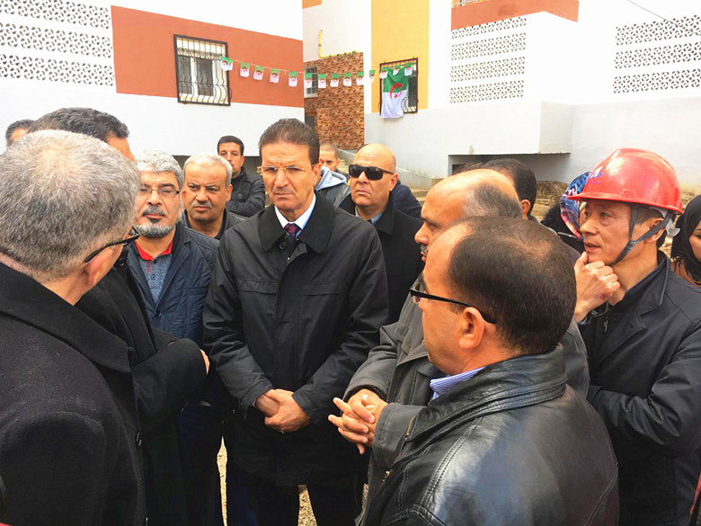 Accompanied by Mr. Zitouni Faycal, AADL’s Eastern Region Manager, Mr. Cazrani, AADL’s Director of Constantine, Mr. Lamine, Mr. Achraf and Mr. Seik, Directors on sites from the Employer’s side, and Mr. Huang Huawen, Deputy Manager of Constantine 6000-unit Housing Project, the Delegation has inspected the showroom at Plot 25 after they listened to the report by Mr. Zitouni Faycal on project progress and completion plans. The Governor spoke highly of ACEG’s construction quality and orderly sites.