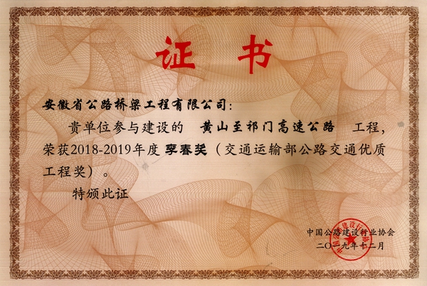“Li Chun Award” was named after Li Chun - a famous craftsman who designed and built the Zhaozhou Bridge in Sui Dynasty more than 1,400 years ago, known as the best preserved ancient single-span stone arch bridge in the world. “Li Chun Award” is the highest national award granted to highway projects of excellent construction qualities and also the highest honor for highway builders in China.