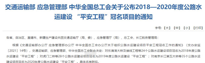 The campaign of “Safe Project” crowning was co-organized by the Ministry of Transport, Ministry of Emergency Management and All-China Federation of Trade Unions, and designed to push forward a long-term mechanism for safe construction on worksites and continue to optimize the safety managements of highway and waterway building projects and guide and encourage all enterprises to strengthen their efforts for work safety. Tuo River and Hui River are key regional waterways in central China and planned to be updated by Henan and Anhui provinces has been included in the 12th Five-Year Plan of the Ministry of Transport, upon completion, it will be of great significance to the better construction of the Belt and Road and the Yangtze River Economic Belt as well as the promotion of waterway transport and economic and social developments in the region.